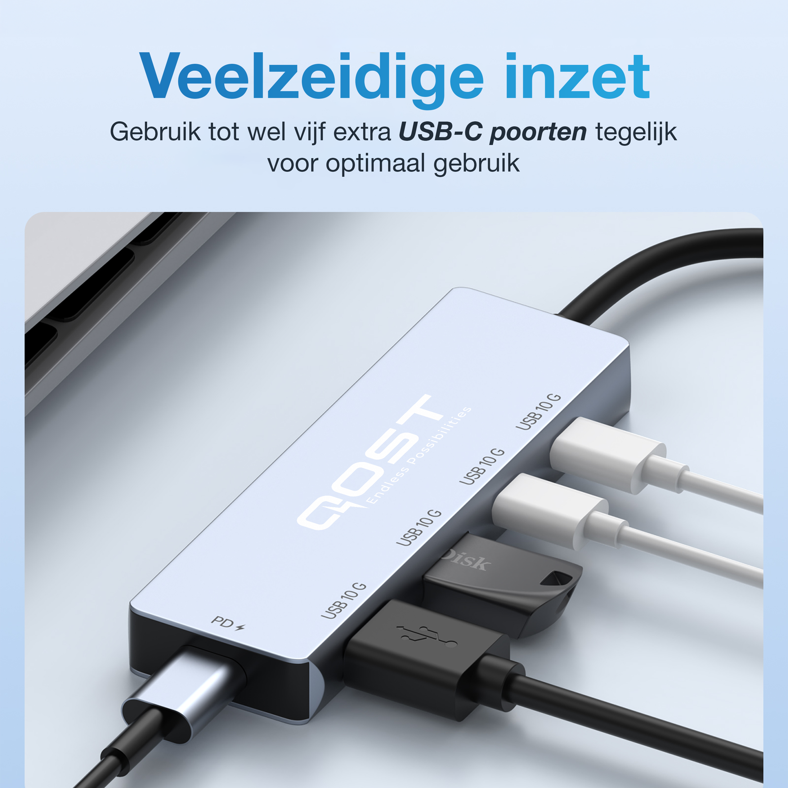 De Qost USB-C Hub 10 Gbps combineert snelheid, betrouwbaarheid en design in één compacte adapter. Perfect voor iedereen die meerdere USB-C en USB-A apparaten wil aansluiten op een moderne USB-C laptop of tablet, zonder concessies te doen aan prestaties of uitstraling.