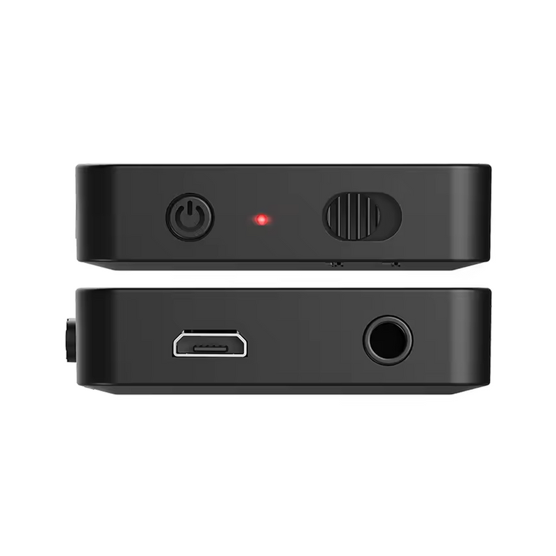 Dit compacte en lichtgewicht apparaat heeft een strak zwart ontwerp met een rasterstructuur voor extra grip en een moderne uitstraling. Dankzij het eenvoudige schuifmechanisme schakel je moeiteloos tussen TX-modus (transmitter) en RX-modus (receiver). De ingebouwde LED-indicator toont direct de status van het apparaat. Aansluiten doe je met de meegeleverde 3.5mm audiokabel of RCA-adapter, terwijl de micro-USB-poort zorgt voor efficiënte voeding.