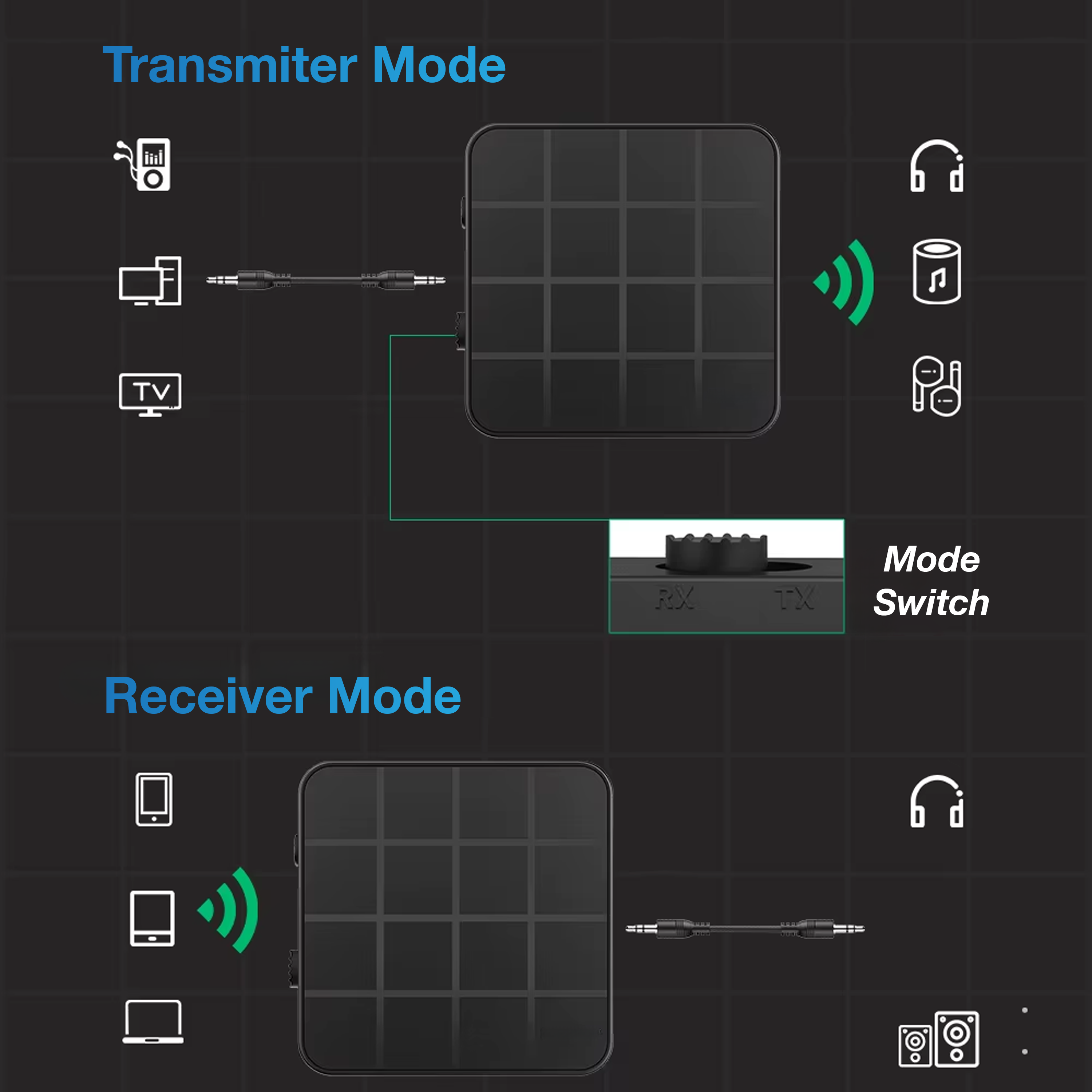 - 2-in-1 functie: Bluetooth Transmitter (TX) & Receiver (RX).