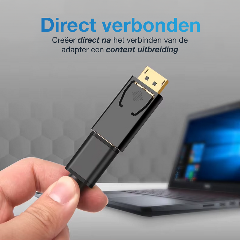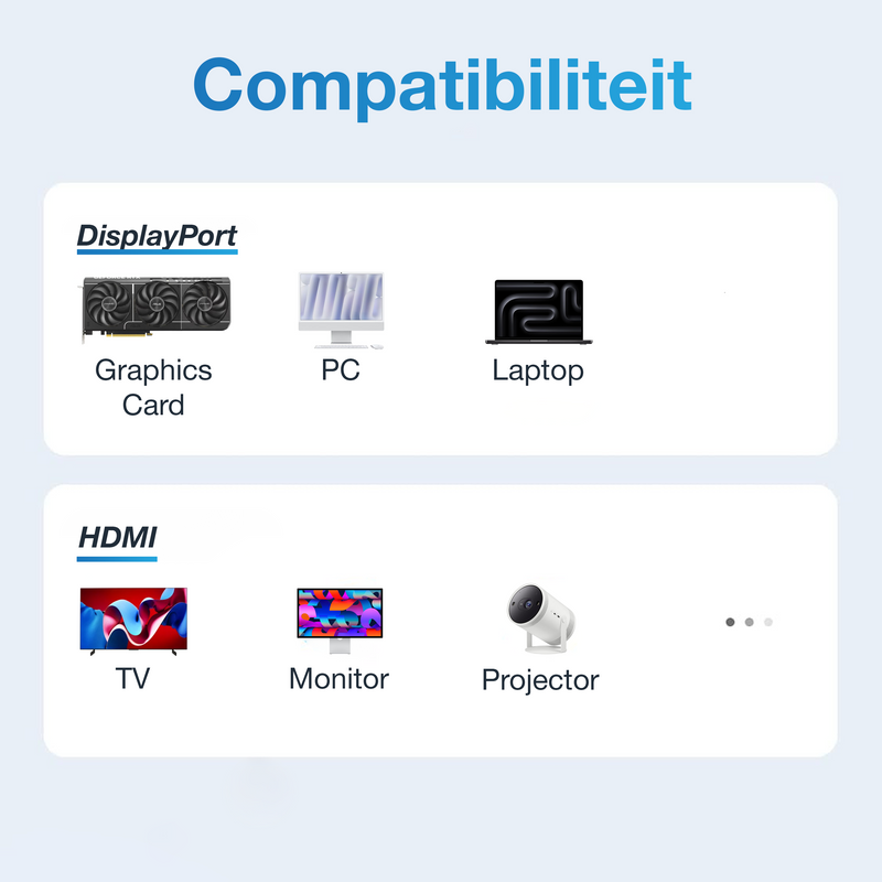 Geschikt voor apparaten met DisplayPort zoals laptops, pc's en grafische kaarten, en compatibel met HDMI-schermen zoals monitoren, tv's en beamers.