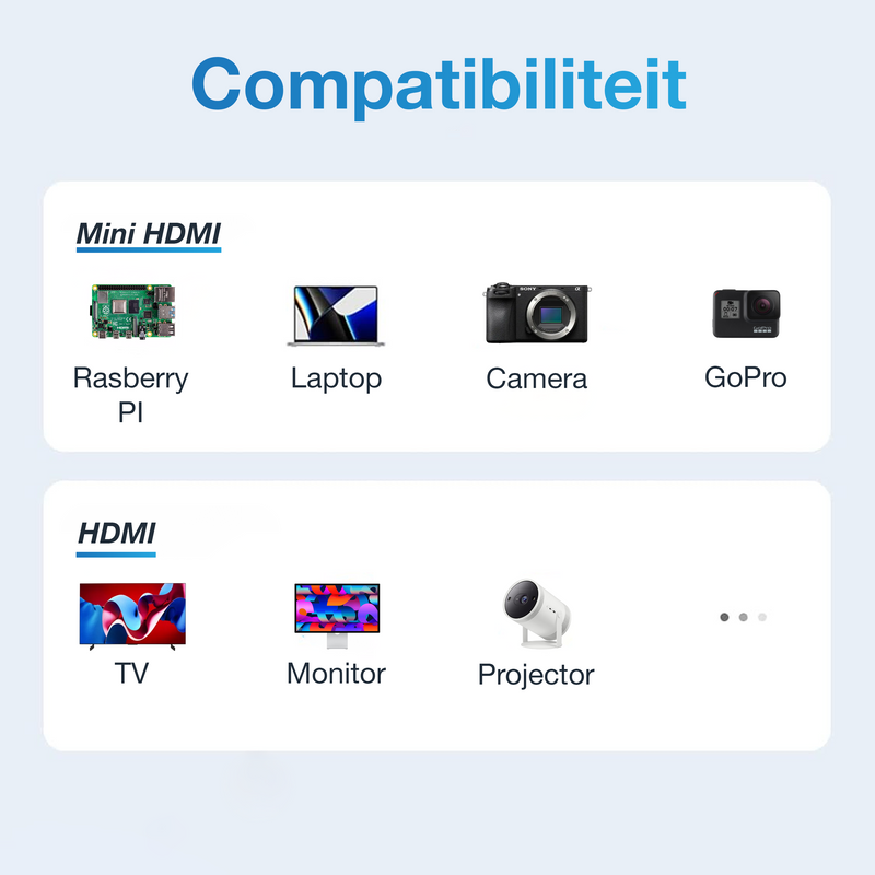 • Compatibiliteit: Camera’s, camcorders, laptops, tablets, tv’s, monitoren en projectoren