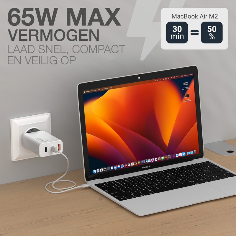 - Snel opladen – Met een maximaal vermogen van 65W laad je smartphones, tablets en laptops sneller op dan met standaard opladers.