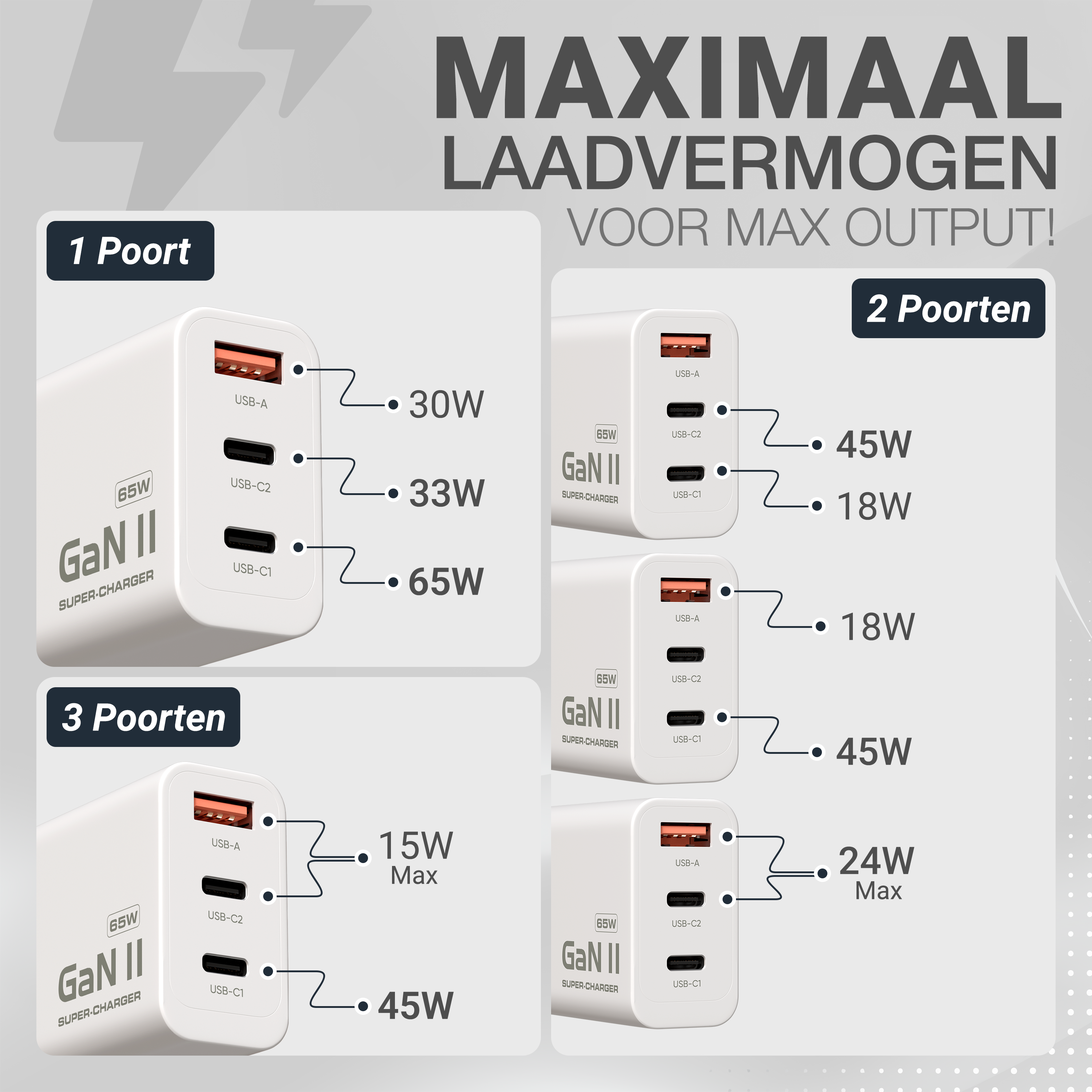 - Slimme stroomverdeling – De oplader past automatisch het vermogen aan op basis van het aangesloten apparaat voor veilig en efficiënt opladen.