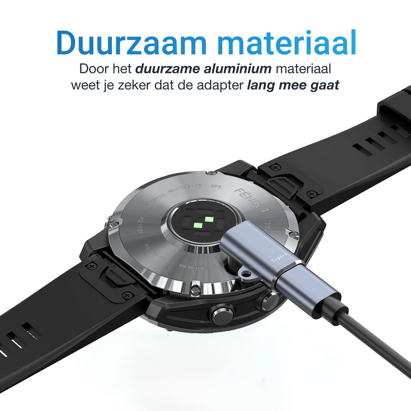Met deze grijs aluminium USB-C naar Garmin adapter laad je je Garmin device altijd en overal snel, veilig en stijlvol op – zonder losse kabels en altijd handig bij je.