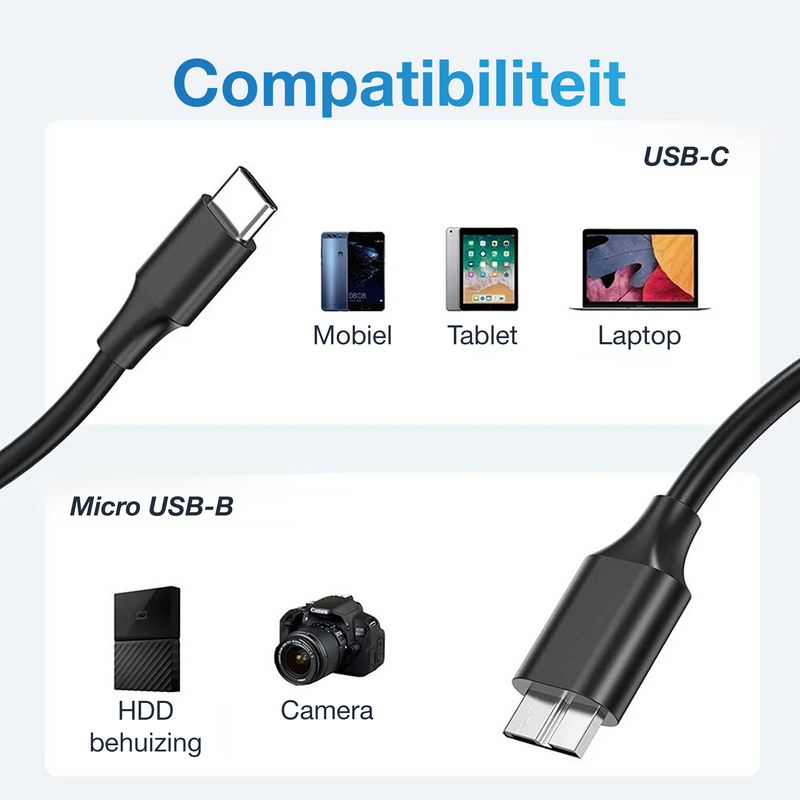 • Universele compatibiliteit: Werkt naadloos met USB-C apparaten zoals laptops en smartphones, en Micro USB-B toestellen zoals externe harde schijven, digitale camera’s en oudere apparaten.